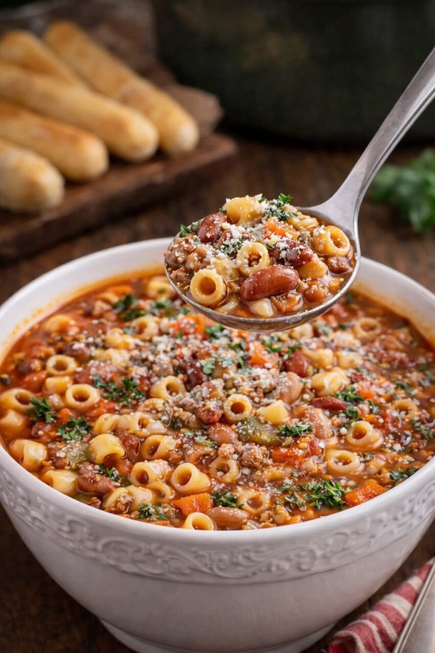 Pasta e Fagioli 🍝🥣 — a classic Italian “pasta and bean” soup that’s hearty, comforting, and full of flavor. It combines beans, small pasta, vegetables, and a savory broth for a wholesome meal.