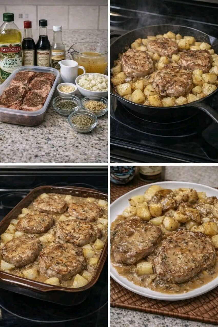 • Add pork chops and sear 3–4 minutes per side until golden brown.
