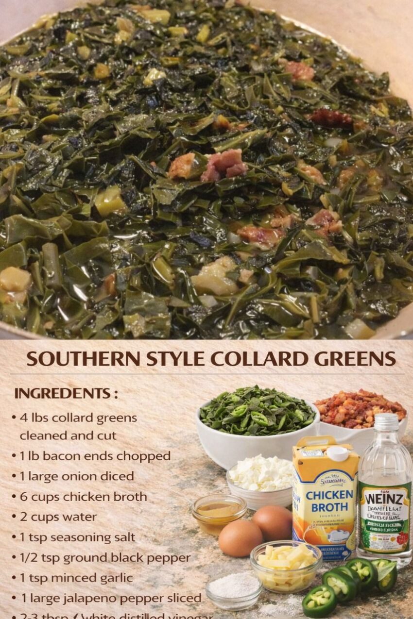 Here’s a classic Southern collard greens recipe 🥬—slow-simmered, smoky, and full of deep, soulful flavor, just like it’s meant to be.