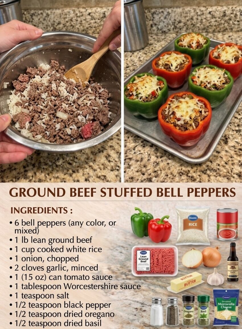 Here’s a classic, hearty recipe for stuffed peppers with ground beef and rice—simple, filling, and packed with flavor.