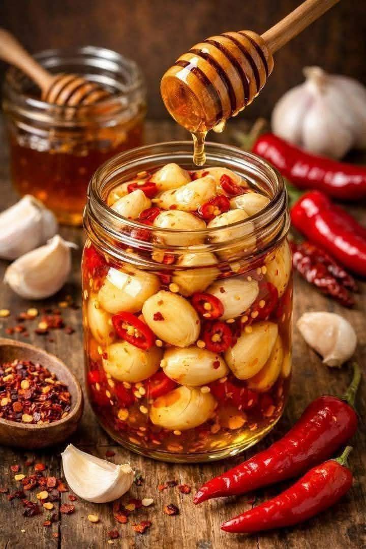 Here’s a recipe for Sweet-Heat Honey Pickled Garlic—a perfect balance of sweet, spicy, and tangy that works as a snack, condiment, or topping 🍯🌶🧄