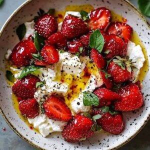 - Toss strawberries with honey, olive oil, salt, and optional balsamic.